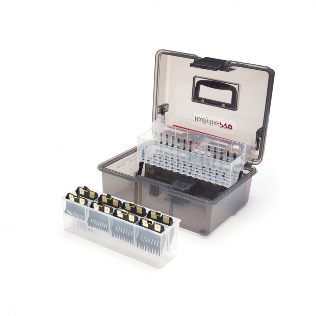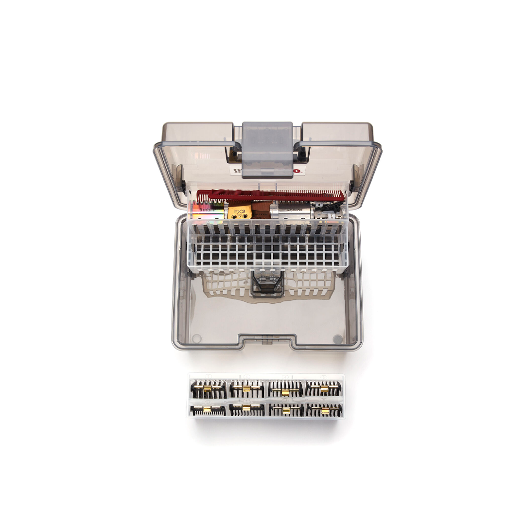 - Compartimentos internos duplos para imersão de tesouras, pentes, lâminas e guias de corte. :SIM