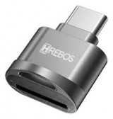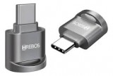 Adaptador OTG H'Rebos HS-661 para cartão de memória, com conexão Type-C, na cor prata. Ele permite a leitura de cartões de memória MicroSD diretamente em dispositivos com porta USB-C, como smartphones, tablets e notebooks, de forma rápida e prática.