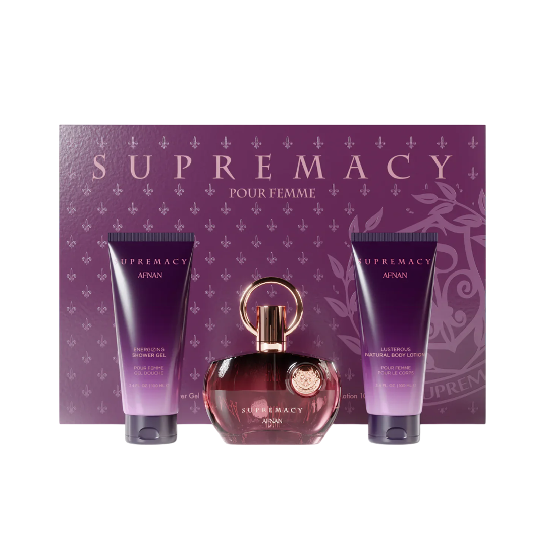 O Afnan Supremacy Pour Femme Kit — com EDP 100 ml + body lotion 100 ml + shower gel 100 ml — é uma fragrância feminina sofisticada e versátil, ideal para quem deseja um aroma marcante e elegante para o dia a dia ou ocasiões especiais.
