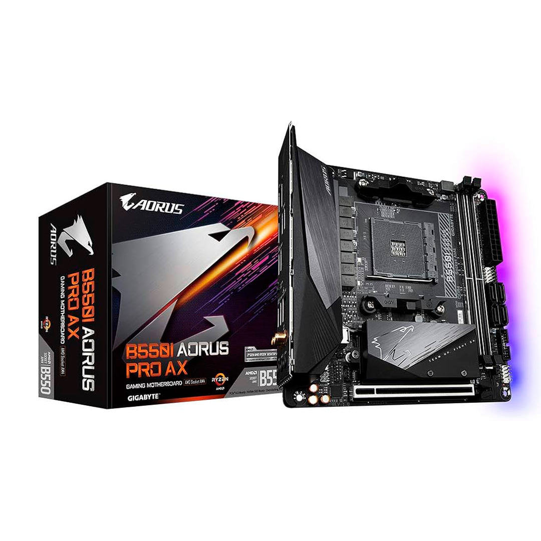 A Gigabyte B550I AORUS AX é uma placa-mãe Mini-ITX potente e compacta, ideal para montar um PC gamer pequeno sem perder desempenho. Seu diferencial está no suporte ao PCIe 4.0, Wi-Fi 6, BIOS robusta e compatibilidade com processadores Ryzen de alta performance.
