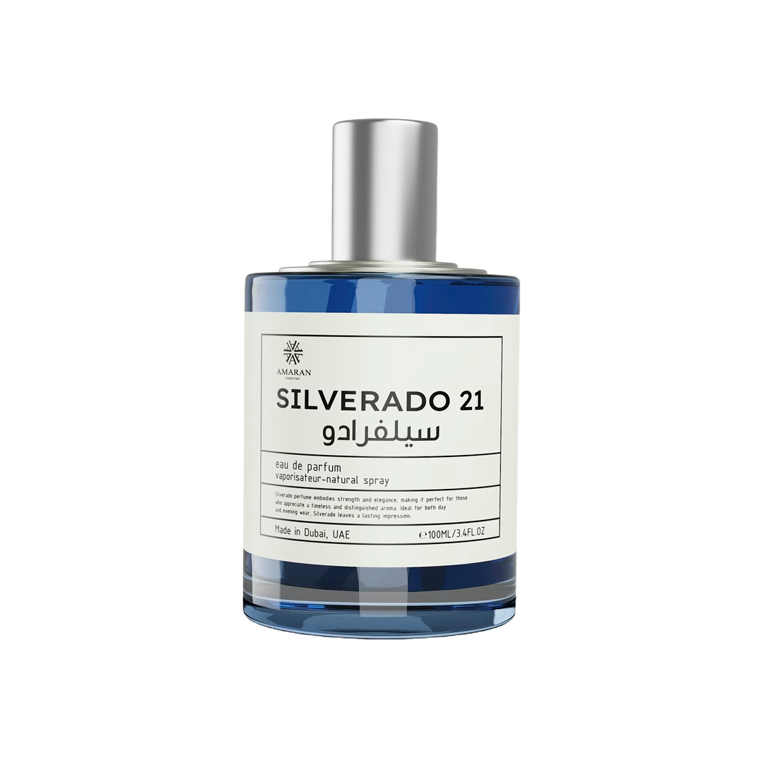 A Amaran é uma casa de perfumaria de Dubai (EAU) focada em redefinir a fragrância moderna com equilíbrio e presença atemporal. O conceito do "Silverado 21" é "incorporar o sentimento de ser vitorioso". É uma fragrância projetada para quem enfrenta desafios com confiança e energia, inspirando-se no perfil olfativo de sucesso de Invictus Legend (Paco Rabanne).