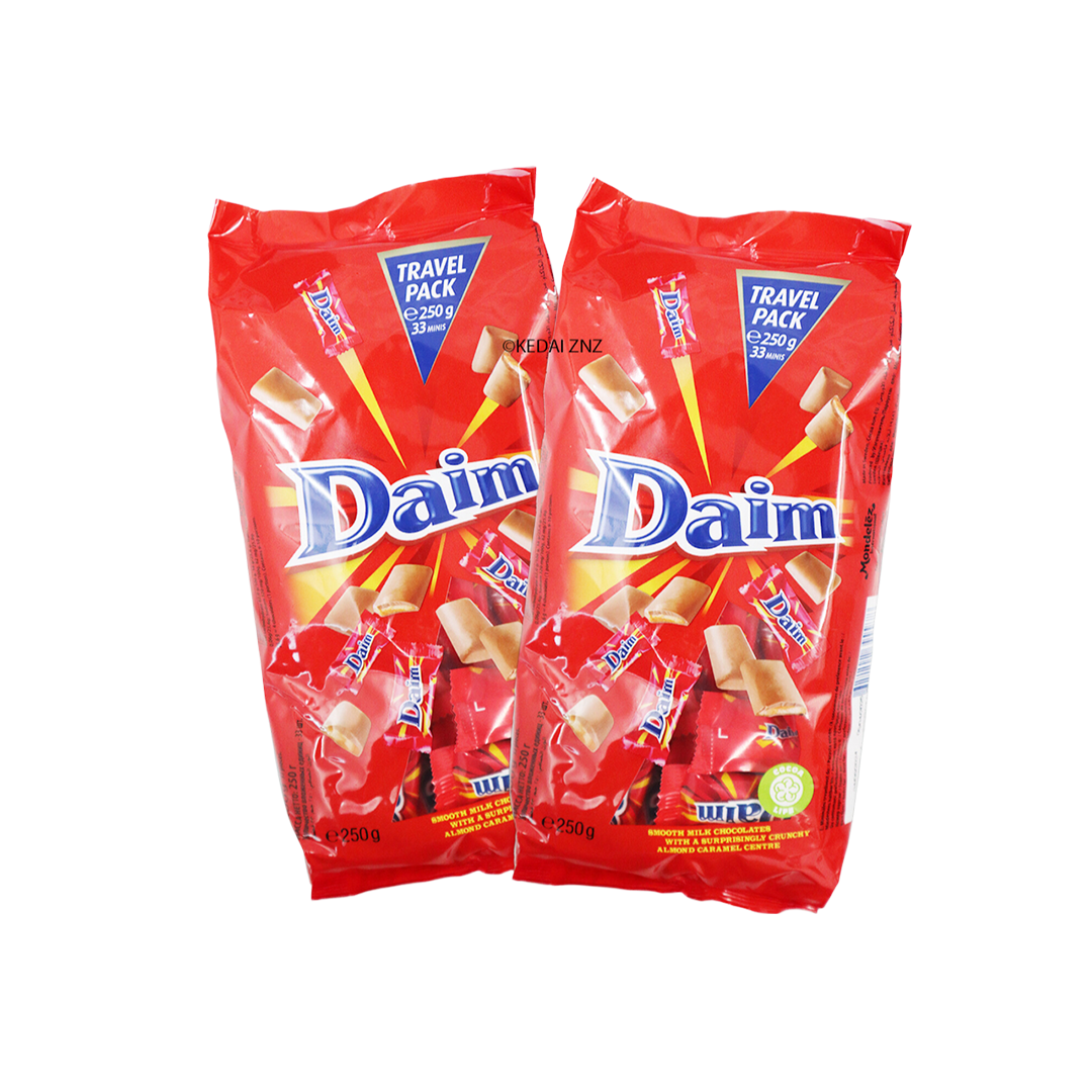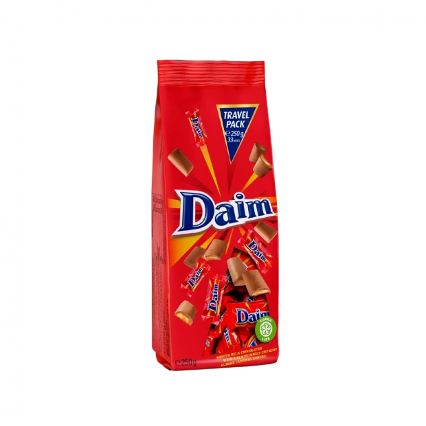 Criadas na Suécia em 1953, as balas Daim são um clássico europeu que conquistou o mundo com sua textura única e sabor marcante. O recheio crocante de caramelo com amêndoas é coberto por uma camada generosa de chocolate ao leite, resultando em uma combinação irresistível que agrada todas as idades.