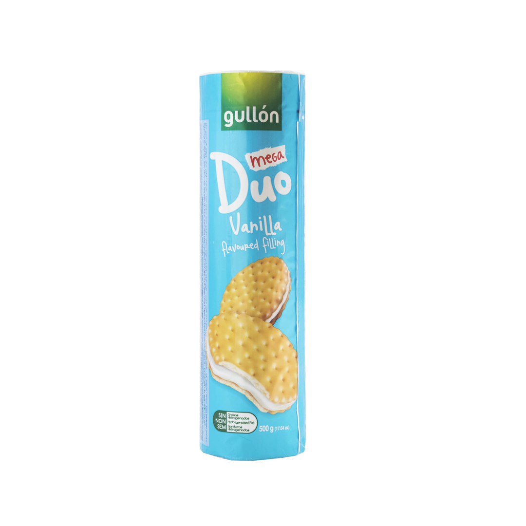 A marca Gullón, originária da Espanha, destaca-se por oferecer biscoitos de qualidade com diversas linhas de sabores. A linha Mega Duo combina textura de biscoito com recheio cremoso em versões saborizadas variadas, sendo a versão Vanilla uma opção doce clássica que agrada a muitos perfis de consumidor.
