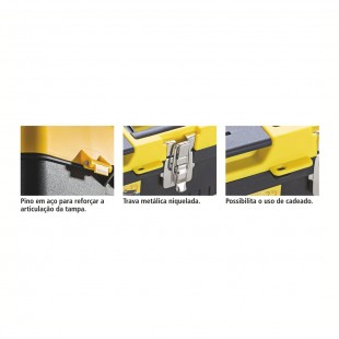 - Caixa robusta e durável, projetada para proteger suas ferramentas e suportar o uso diário.