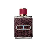 O frasco reflete a ousadia da fragrância: revestido com couro em estampa de onça, o design é complementado por um logo azul claro e uma tampa de couro vinho, conferindo um visual luxuoso e moderno.