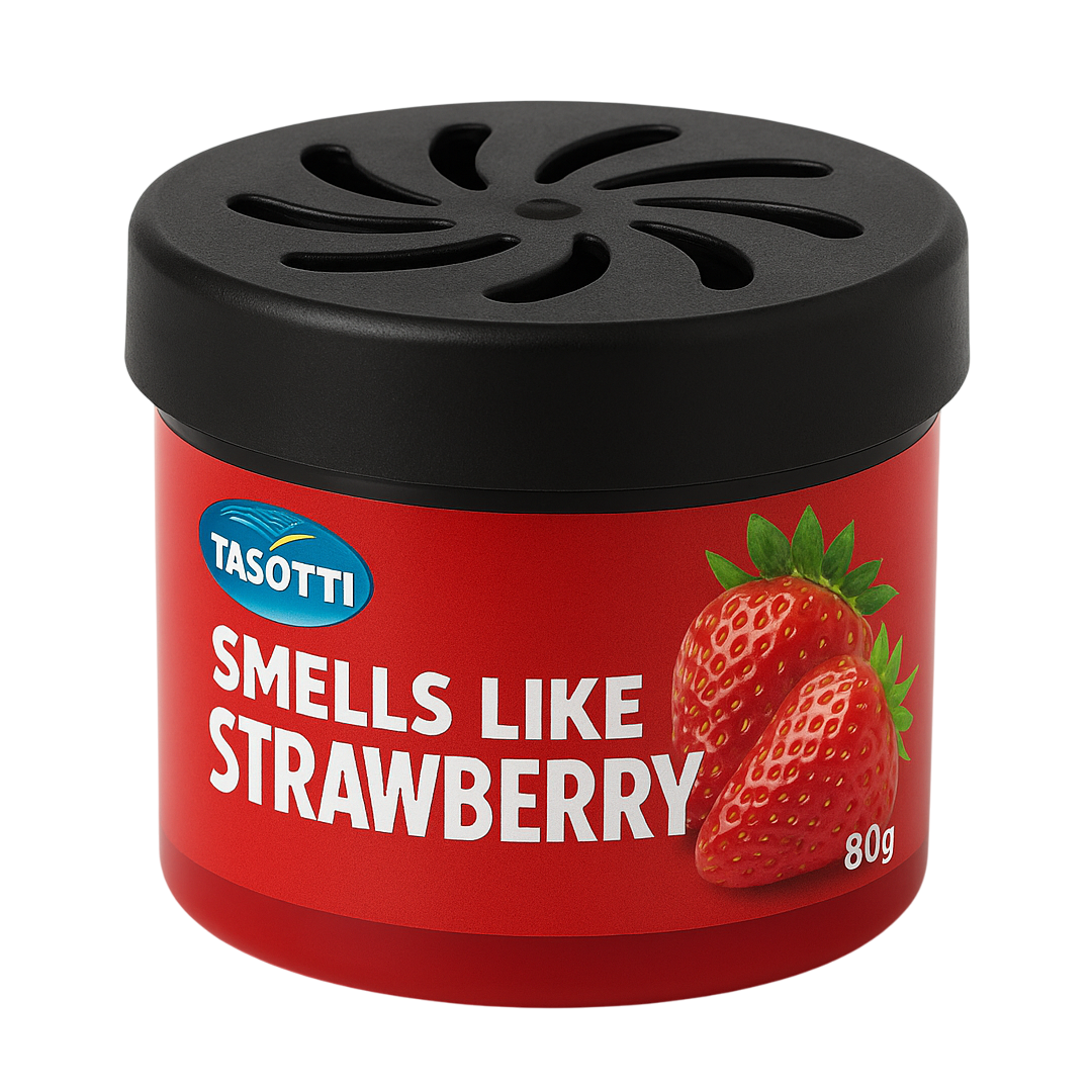 A linha Smells Like da Tasotti traz fragrâncias em formato de gel aromatizante, conhecidas pela longa duração e liberação gradual do perfume. A versão Strawberry foi criada para quem gosta de cheiros doces e vibrantes, inspirando sensação de alegria e leveza dentro do carro ou pequenos ambientes.