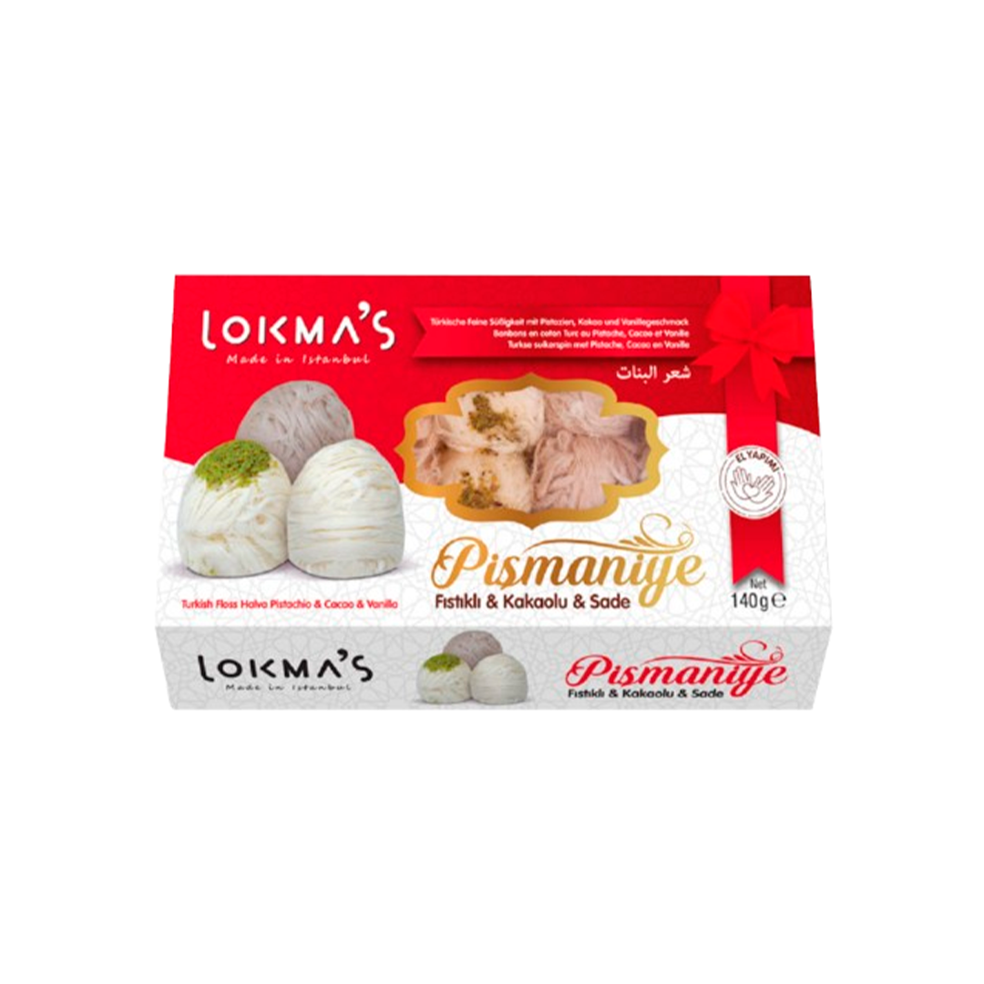O doce turco Pişmaniye da marca Lokmas no sabor romã (Narli) 140 g é uma sobremesa leve e macia, semelhante a fios de algodão, com sabor adocicado e leve aroma frutado de romã.