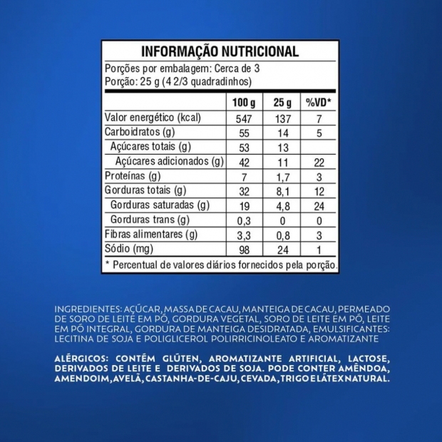 Ingredientes Principais: Açúcar; leite em pó integral; massa de cacau; manteiga de cacau; soro de leite em pó; gordura vegetal; emulsificantes (lecitina de soja, poliglicerol polirricinoleato); aromatizante.