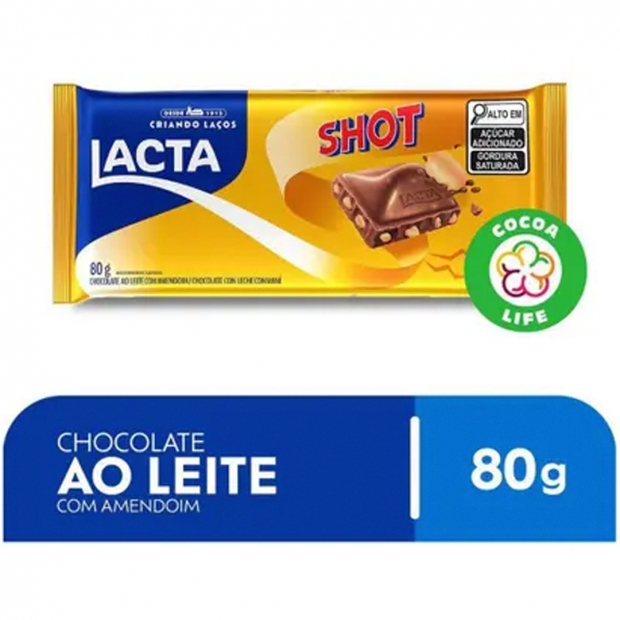 O Chocolate Lacta Shot 80 g é uma barra que une a suavidade do chocolate ao leite à crocância intensa do amendoim. Em cada mordida, você sente primeiro o derreter cremoso do chocolate e logo depois a textura marcante dos pedaços de amendoim tostados. É uma combinação que agrada tanto quem ama chocolate doce quanto quem gosta de contraste de texturas.