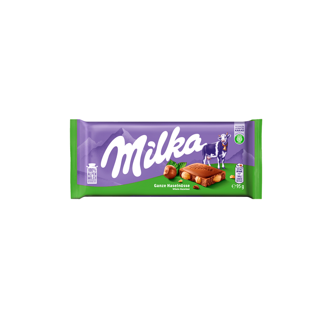 - Sabor:chocolate ao leite Milka com avelãs inteiras
