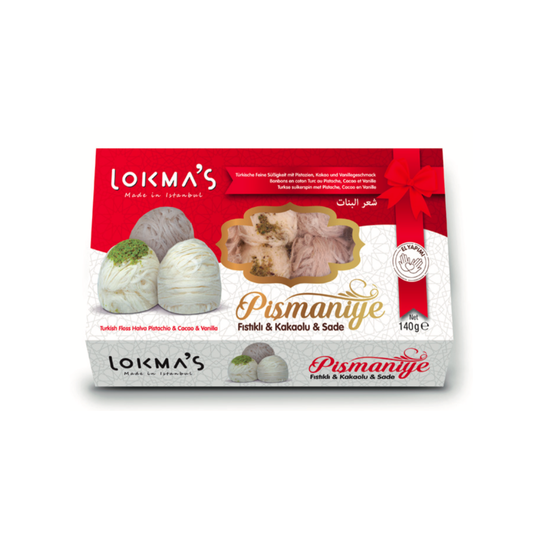 Lokmas é uma marca tradicional turca, reconhecida pela qualidade de seus doces artesanais, como a pismaniye. A pismaniye é um doce típico da Turquia, conhecido como "algodão doce turco", e a versão Fıstıklı & Kakao combina o melhor da tradição turca com a riqueza do cacau e a crocância das pistaches, criando uma iguaria irresistível e cheia de sabor.