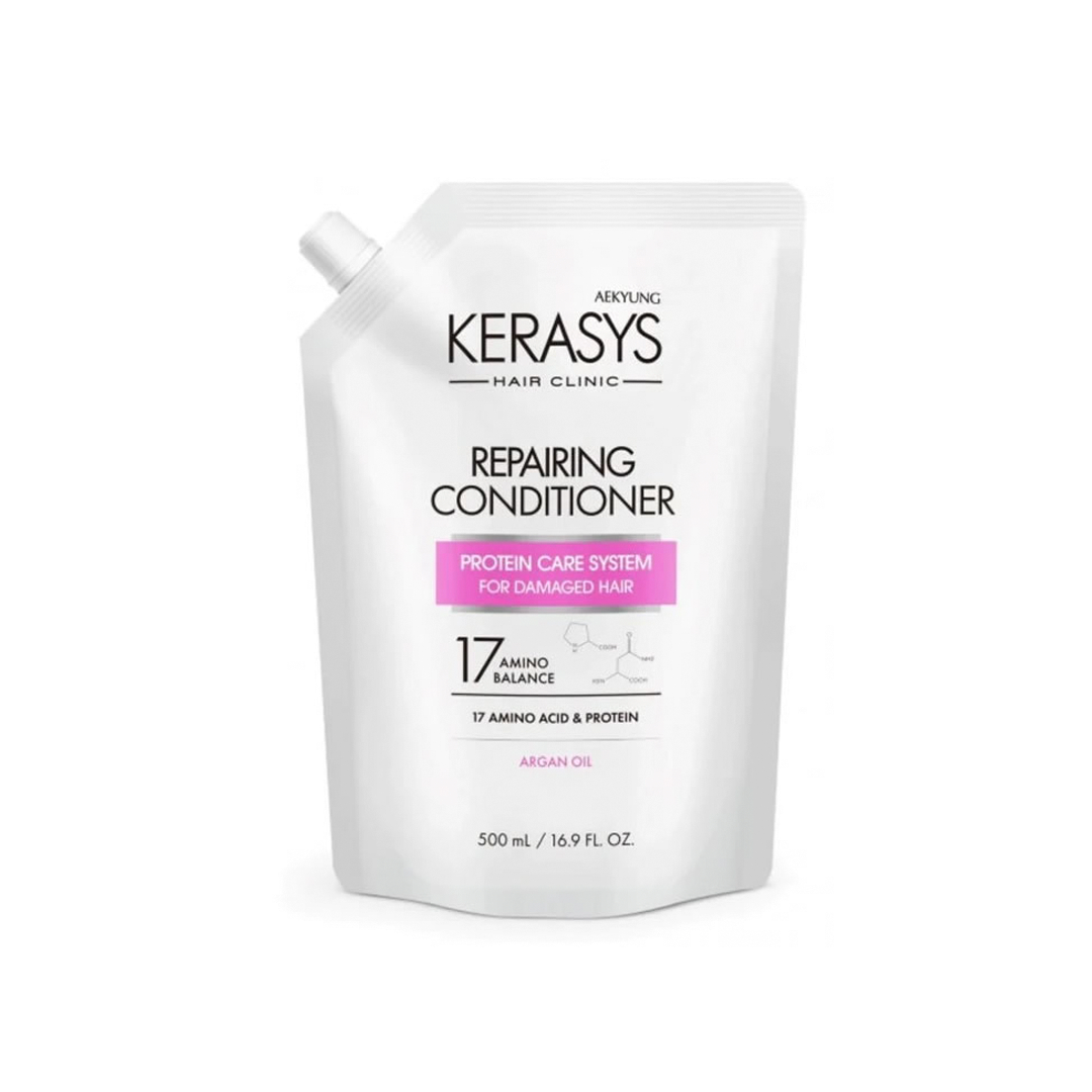 Introdução breve: O Condicionador Kerasys Repairing Argan Oil Refil 500ml foi desenvolvido para reparar e nutrir profundamente cabelos danificados, secos ou quimicamente tratados. Sua fórmula enriquecida com óleo de argan e proteínas vegetais fortalece a fibra capilar, reduz o frizz e devolve o brilho natural, deixando os fios mais macios, hidratados e com aparência saudável. Proporciona um toque sedoso e movimento leve desde a primeira aplicação.