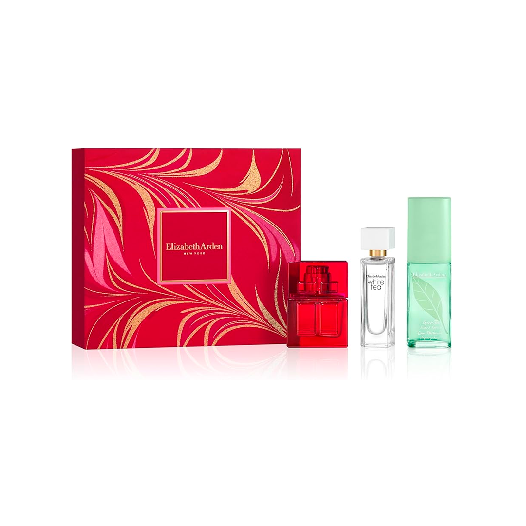 O kit Elizabeth Arden reúne três fragrâncias de sucesso que representam a leveza, a sensualidade e a sofisticação da mulher moderna. Green Tea é refrescante e vibrante, com notas cítricas e florais. Red Door é uma fragrância clássica, luxuosa e intensa, enquanto White Tea transmite frescor e pureza, com um toque suave e floral. Juntas, essas fragrâncias oferecem um conjunto de aromas para todas as ocasiões, trazendo a essência da marca Elizabeth Arden.