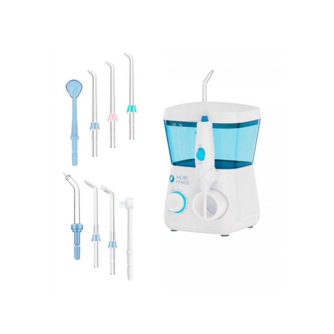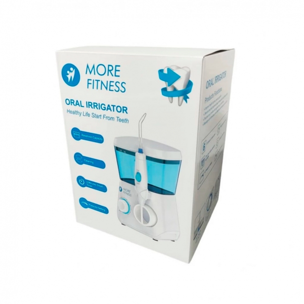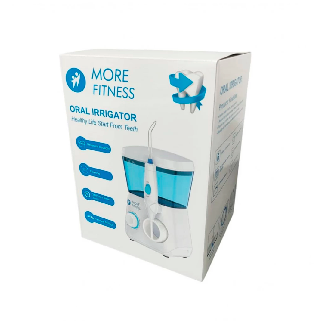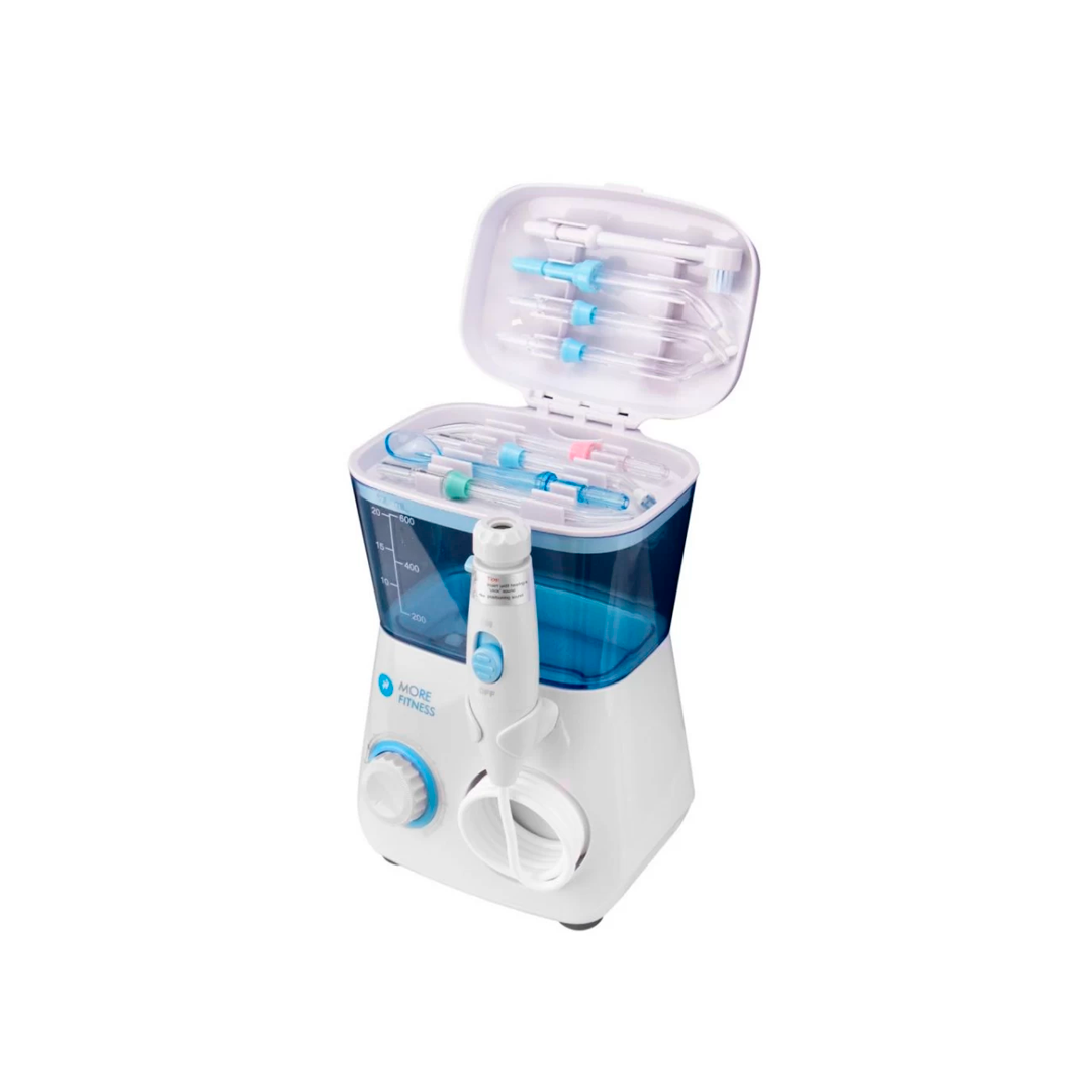 O Irrigador Dental Elétrico More Fitness FC165 de 600 mL, cor branca, é um aparelho projetado para a higienização profunda da cavidade bucal utilizando jato de água pulsado. Ideal para complementar a escovação tradicional, auxilia na remoção de resíduos alimentares, placa bacteriana e massagem das gengivas para promover saúde bucal.