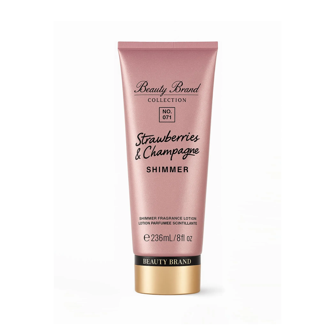 A Loção Corporal Beauty Brand Collection Nº 071 “Strawberries & Champagne Shimmer” 236 ml é um hidratante perfumado com acabamento cintilante que combina a doçura dos morangos frescos com o brilho sofisticado do champanhe, oferecendo pele macia, perfumada e com leve efeito glow.