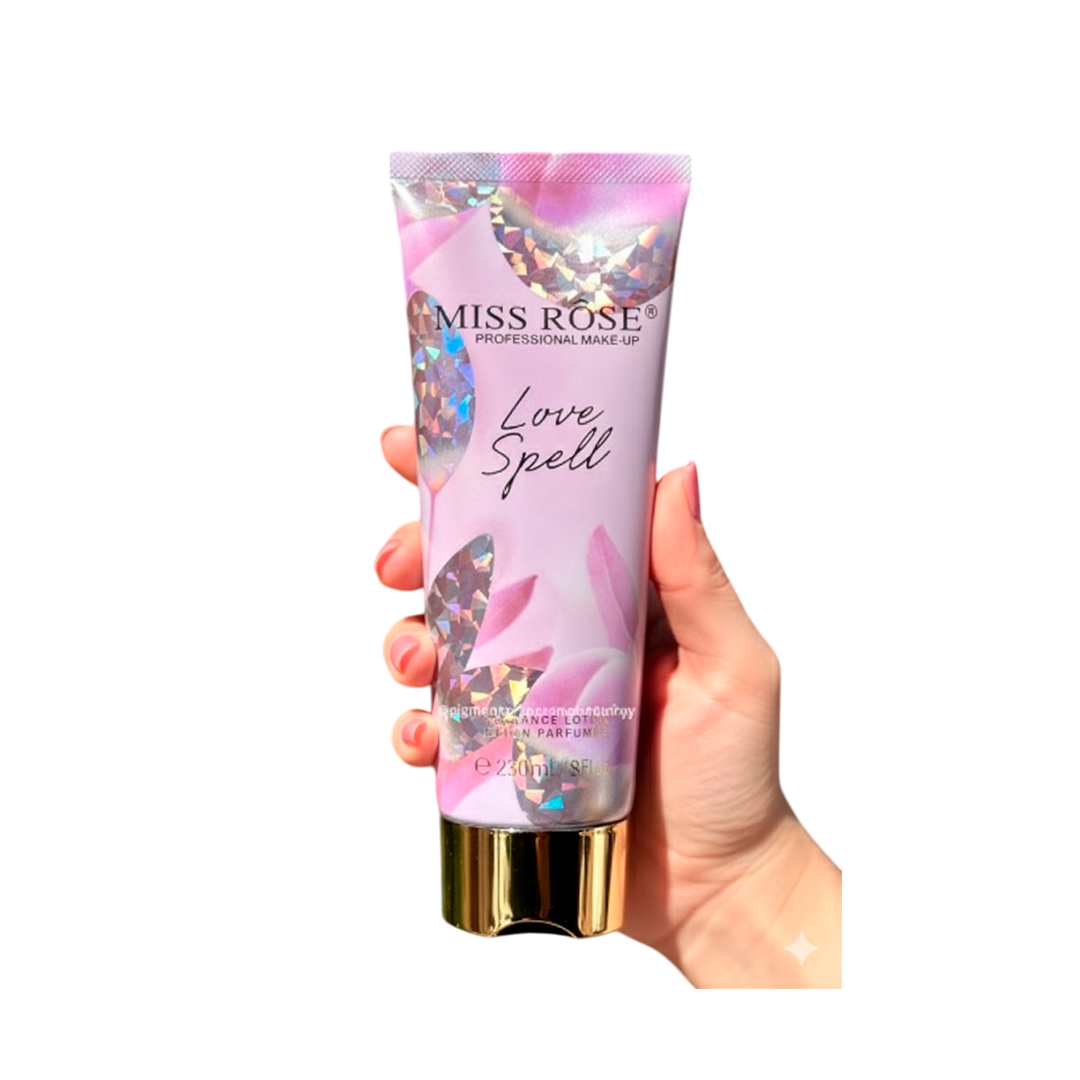 A linha Miss Rose dedica-se a loções corporais perfumadas que aliam hidratação e fragrância inspirada em perfumes populares. A variante Love Spell foi concebida para transmitir leveza e feminilidade, combinando notas suaves e românticas que evocam sentimento de charme e presença.