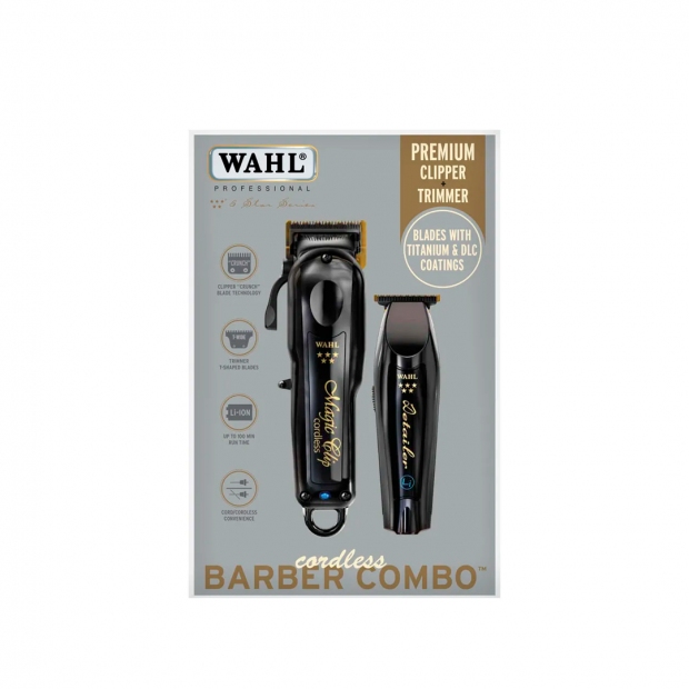 A marca Wahl é referência mundial em ferramentas de corte profissional, presente em barbearias de alto nível há décadas. Este combo representa o nível premium da linha sem fio (“Cordless”), com lâminas de titânio/DLC, motor potente e autonomia estendida — pensado para quem exige velocidade, versatilidade e acabamento refinado.