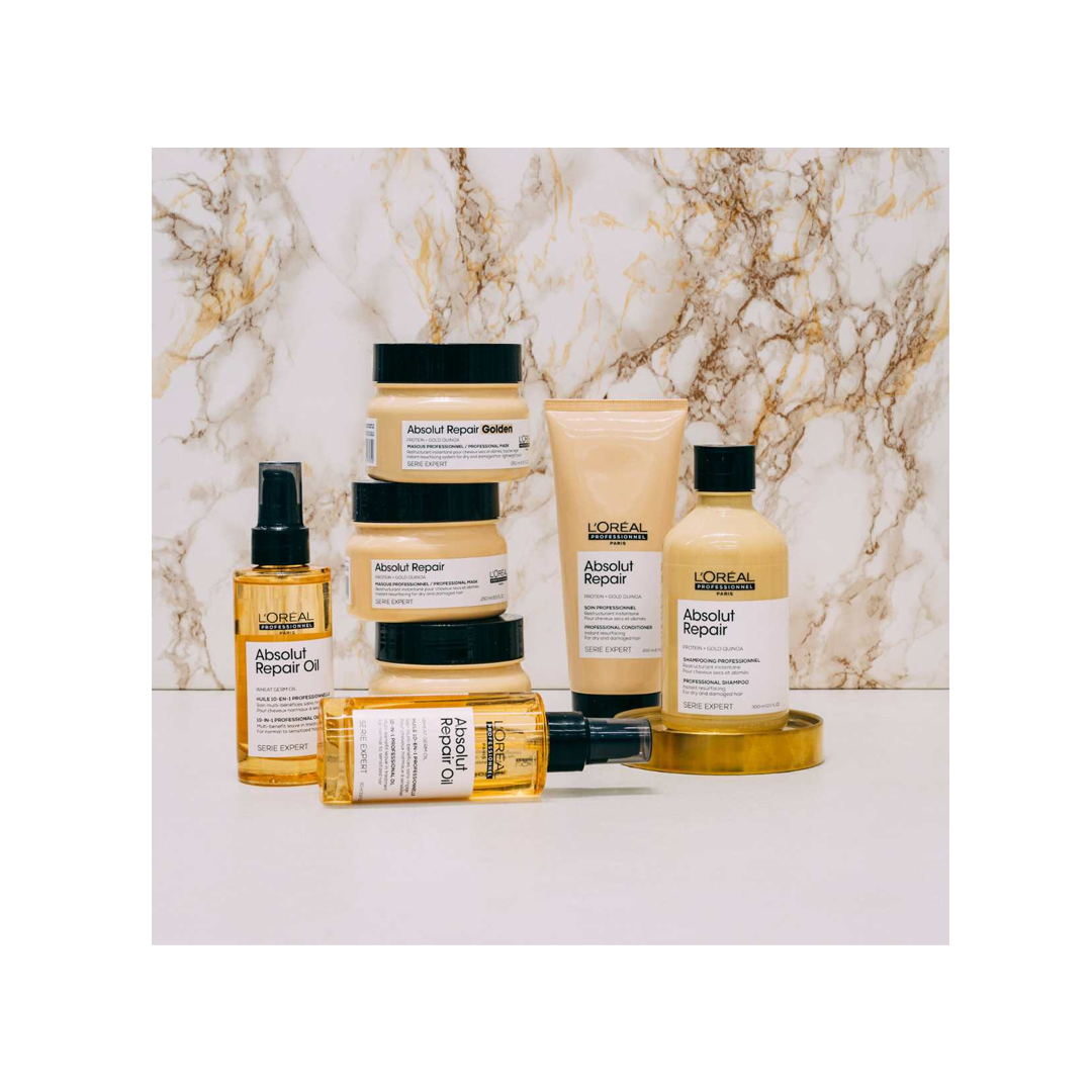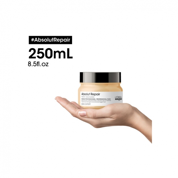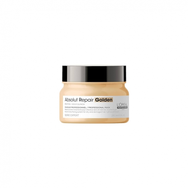 A Máscara L'Oréal Professionnel Absolut Repair Gold Quinoa + Protein proporciona reparação profunda e imediata aos cabelos danificados ou sensibilizados.