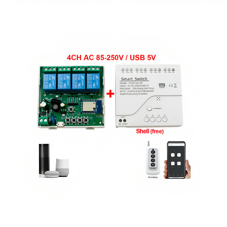 Este produto é um interruptor inteligente sem fio WiFi universal de 4 canais com módulo RF 433MHz, para o seu sistema doméstico inteligente para ligar/desligar remotamente e automaticamente eletrodomésticos e dispositivos eletrônicos por telefone APP. Igualmente pode ser controlado pelo controlador remoto do RF dentro. Pode conectar e controlar quatro dispositivos no APP ao mesmo tempo, e você pode independentemente ligar/desligar cada um dos quatro grupos. Ele também suporta o tempo de ligar/desligar os aparelhos em um horário especificado e compartilhar com outras pessoas para que você possa controlar sua casa inteligente junto com sua família. Você também pode controlar por voz seus eletrodomésticos pelo Amazon Alexa e pelo Google Home/Nest,IFTTT e aproveitar a vida inteligente e tornar sua casa mais inteligente.
