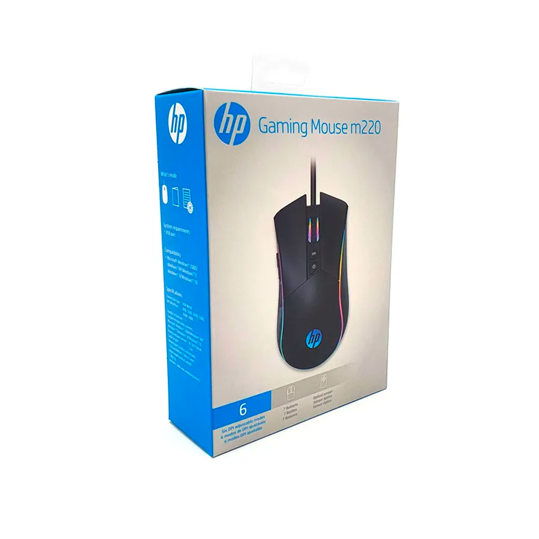 O Mouse USB HP M220 Gaming RGB 7 botões Preto combina precisão, estilo e responsividade com iluminação RGB e sete botões programáveis, ideal para gamers que buscam desempenho acessível e visual impactante em seus setups.