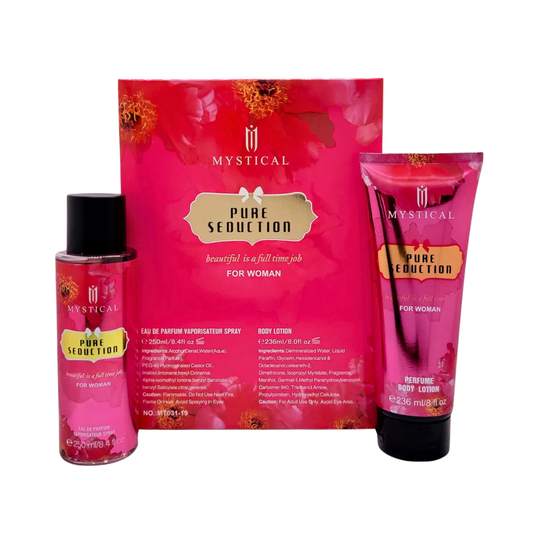 Este kit foi desenvolvido para reunir dois pilares do cuidado pessoal: perfumação e hidratação. A linha “Pure Seduction” inspira uma aura de charme e sedução suave, ideal para uso diário ou momentos especiais. O design do kit enfatiza sofisticação acessível, sendo indicado tanto para uso próprio quanto para presente.
