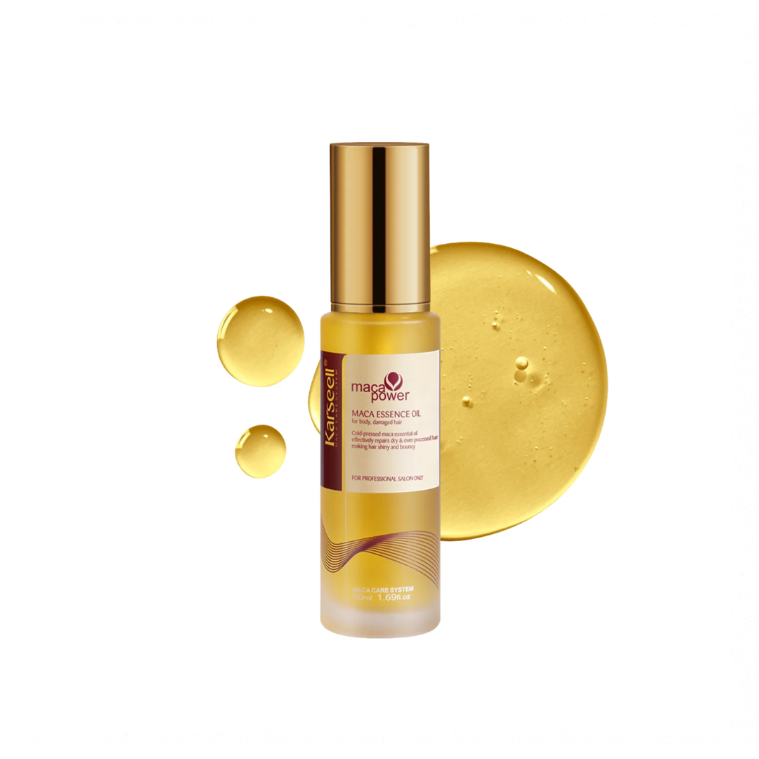 História e conceito: O Karseell Maca Essence Oil foi criado para unir nutrição, reparação e proteção em um único produto, proporcionando cuidado profissional aos cabelos. O conceito do óleo é oferecer fios saudáveis, luminosos e disciplinados, transformando a rotina de cuidados capilares em um ritual de beleza e sofisticação.