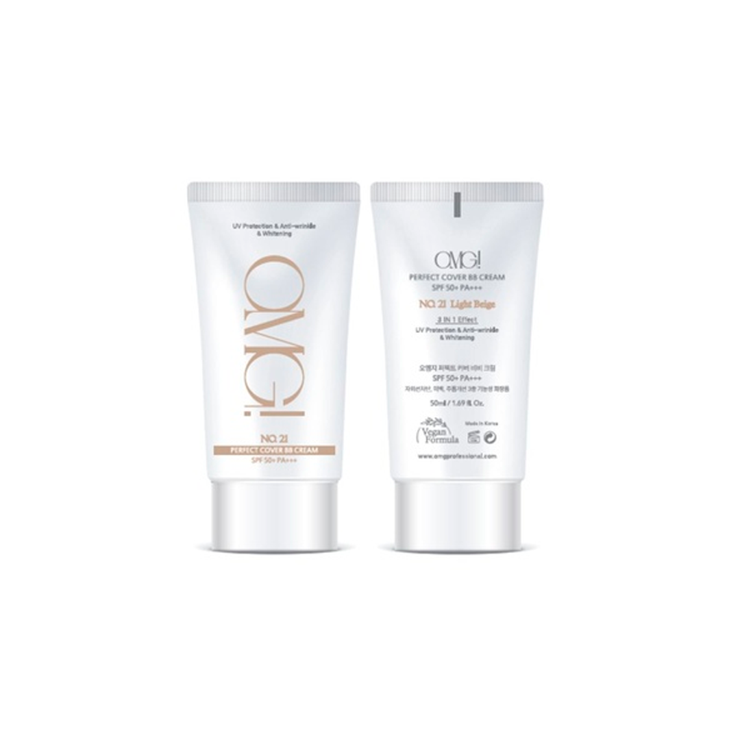 O OMG Seoul No.21 Perfect Cover BB Cream SPF50+ é um produto multifuncional que combina maquiagem e cuidados com a pele em um único passo. Com alta proteção solar (FPS50+ PA++++), ele oferece cobertura média a alta, disfarçando imperfeições e uniformizando o tom da pele. Sua fórmula é enriquecida com ingredientes hidratantes e calmantes, proporcionando um acabamento natural e luminoso, ideal para o uso diário.