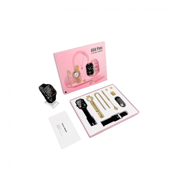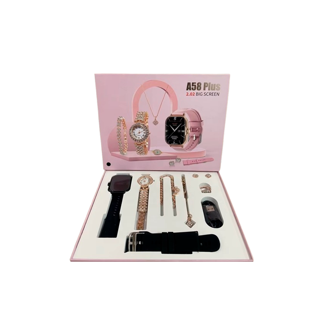 O relógio A58 Plus 2.02 Big Screen combina estilo e tecnologia em um design moderno. Com tela ampla e acabamento sofisticado, oferece diversas funções inteligentes e vem acompanhado de joias exclusivas, unindo elegância e praticidade no dia a dia.