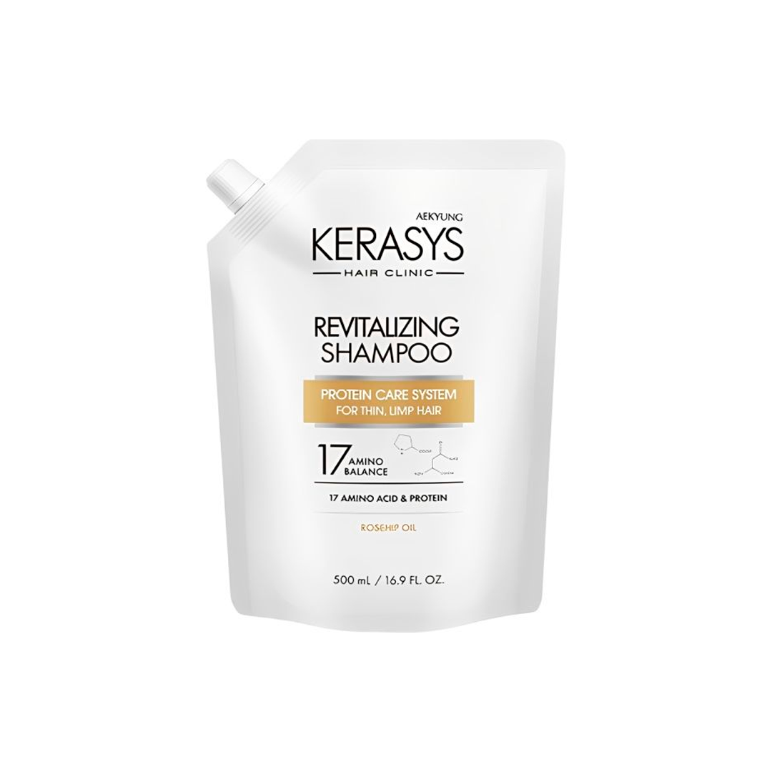 A linha Revitalizing da Kerasys foi desenvolvida para tratar cabelos que sofreram desgaste — finos, sem volume, opacos ou com frizz. A fórmula combina óleo de rosa-mosqueta, 17 aminoácidos e proteínas hidrolisadas (trigo, soja, arroz) para fortalecer e revitalizar os fios em profundidade, resultando em cabelo mais saudável, com brilho e movimento.