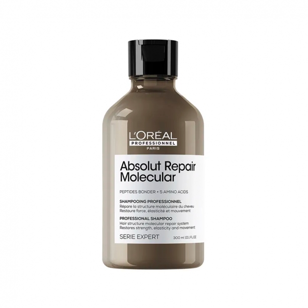 O shampoo Absolut Repair Molecular da L'Oréal Professionnel foi desenvolvido para oferecer tratamento profundo a cabelos danificados ou sobreprocessados, reconstruindo a fibra capilar em nível molecular. O grande diferencial da fórmula está na presença de um "adesivo de peptídeos + 5 aminoácidos" que ajudam a reparar a estrutura macromolecular do cabelo.