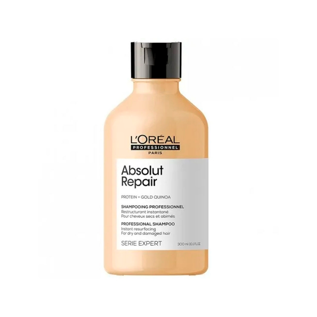 O Shampoo L'Oréal Professionnel Série Expert Absolut Repair Gold Quinoa + Protein 300ml é um tratamento profissional desenvolvido para cabelos danificados e sensibilizados. Sua fórmula enriquecida com extrato de quinoa dourada e proteínas de trigo proporciona uma reparação profunda, restaurando a saúde dos fios e devolvendo brilho e maciez. Ideal para quem busca reconstrução intensiva e proteção contra danos futuros.