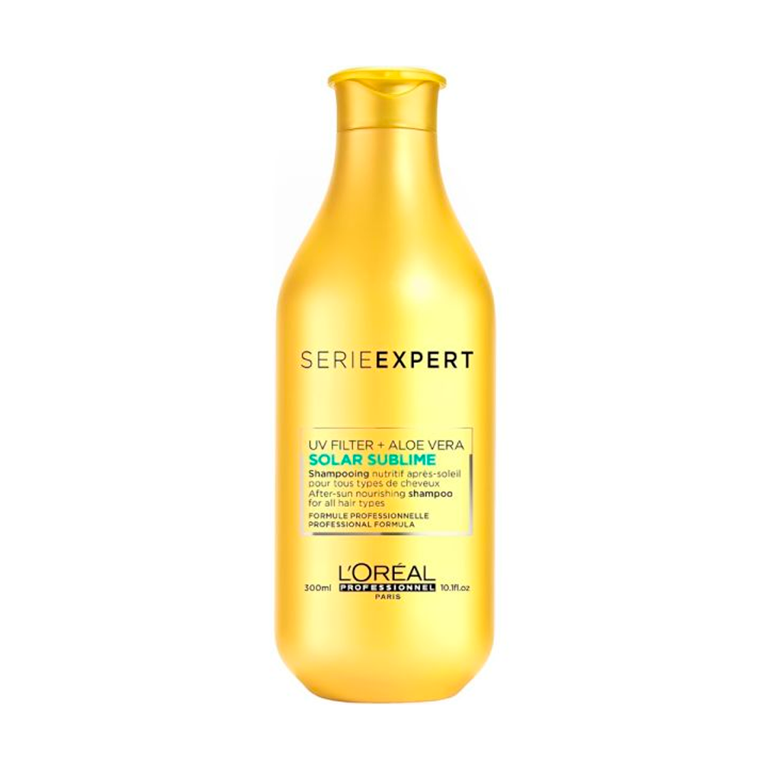 O Shampoo L'Oréal Professionnel Serie Expert Solar Sublime 300ml foi desenvolvido para proteger e reparar os cabelos expostos ao sol, ao mar e ao cloro. Sua fórmula profissional com Aloe Vera e filtro UV limpa suavemente enquanto hidrata e remove resíduos de sal, areia e poluição. O resultado são fios leves, brilhantes e protegidos, perfeitos para o verão ou dias de muita exposição solar.