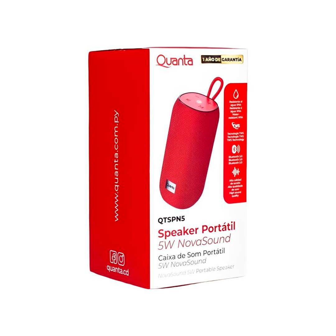 O Speaker Quanta QTSPN5 Vermelho oferece portabilidade, design resistente e som equilibrado para o uso diário. Com Bluetooth, entrada USB e certificação IPX4, ele é ideal para quem busca música em qualquer lugar com praticidade e proteção contra respingos.