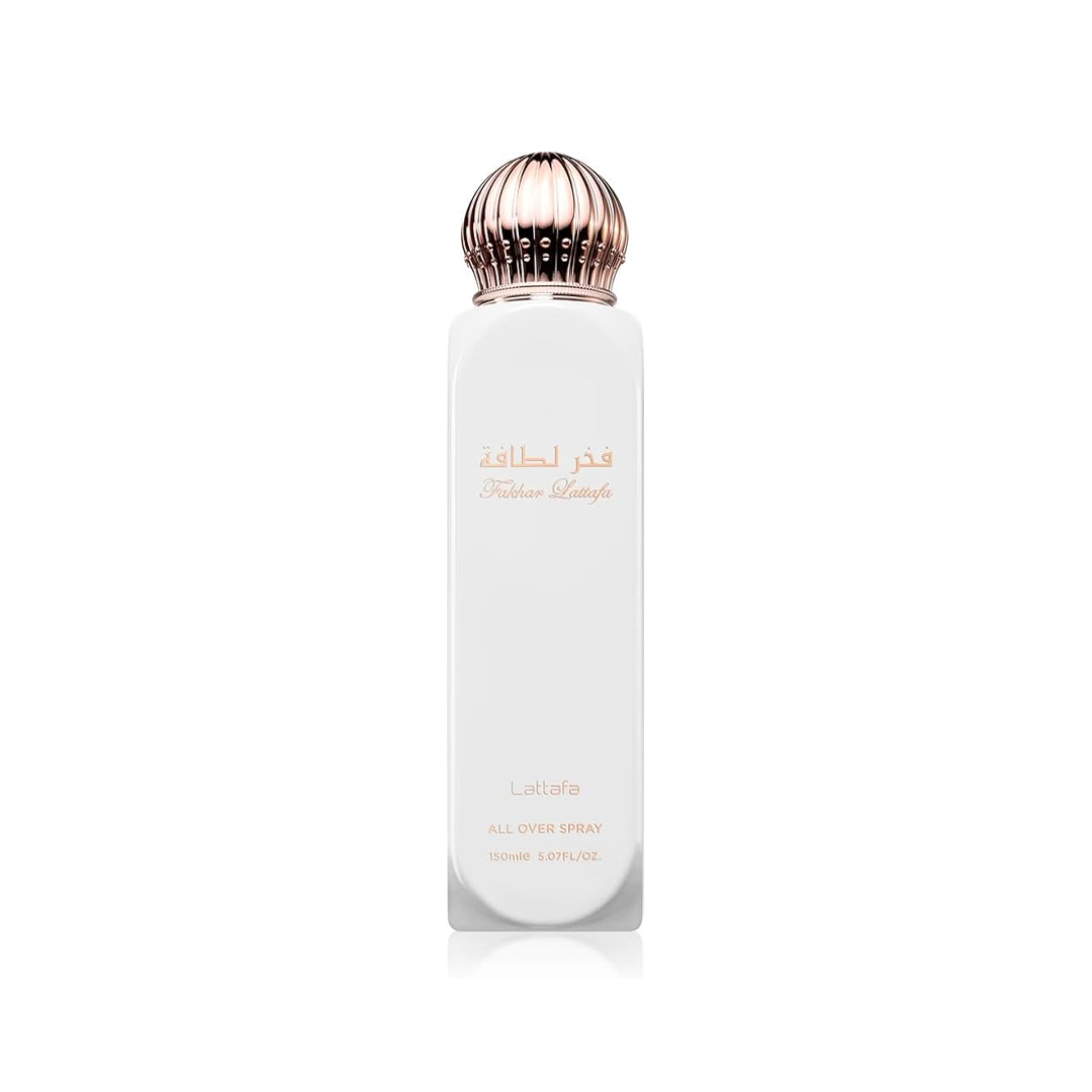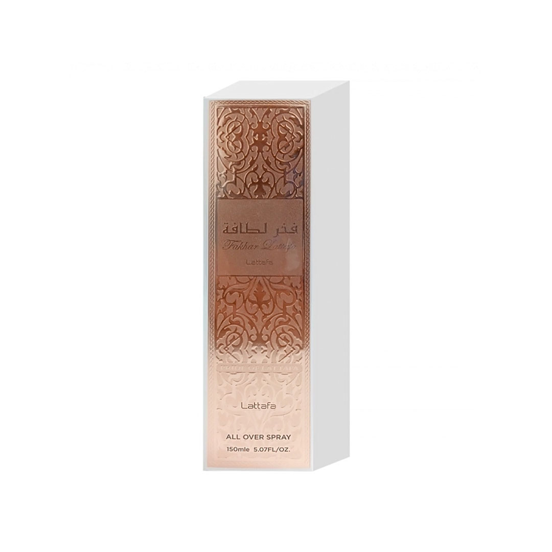 Splash Lattafa All Over Fahkar 150ml surge como uma névoa perfumada que envolve a pele em um aroma envolvente, fresco e elegante, criando uma sensação de cuidado diário com toque sofisticado e confortável