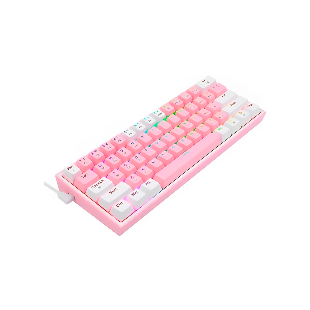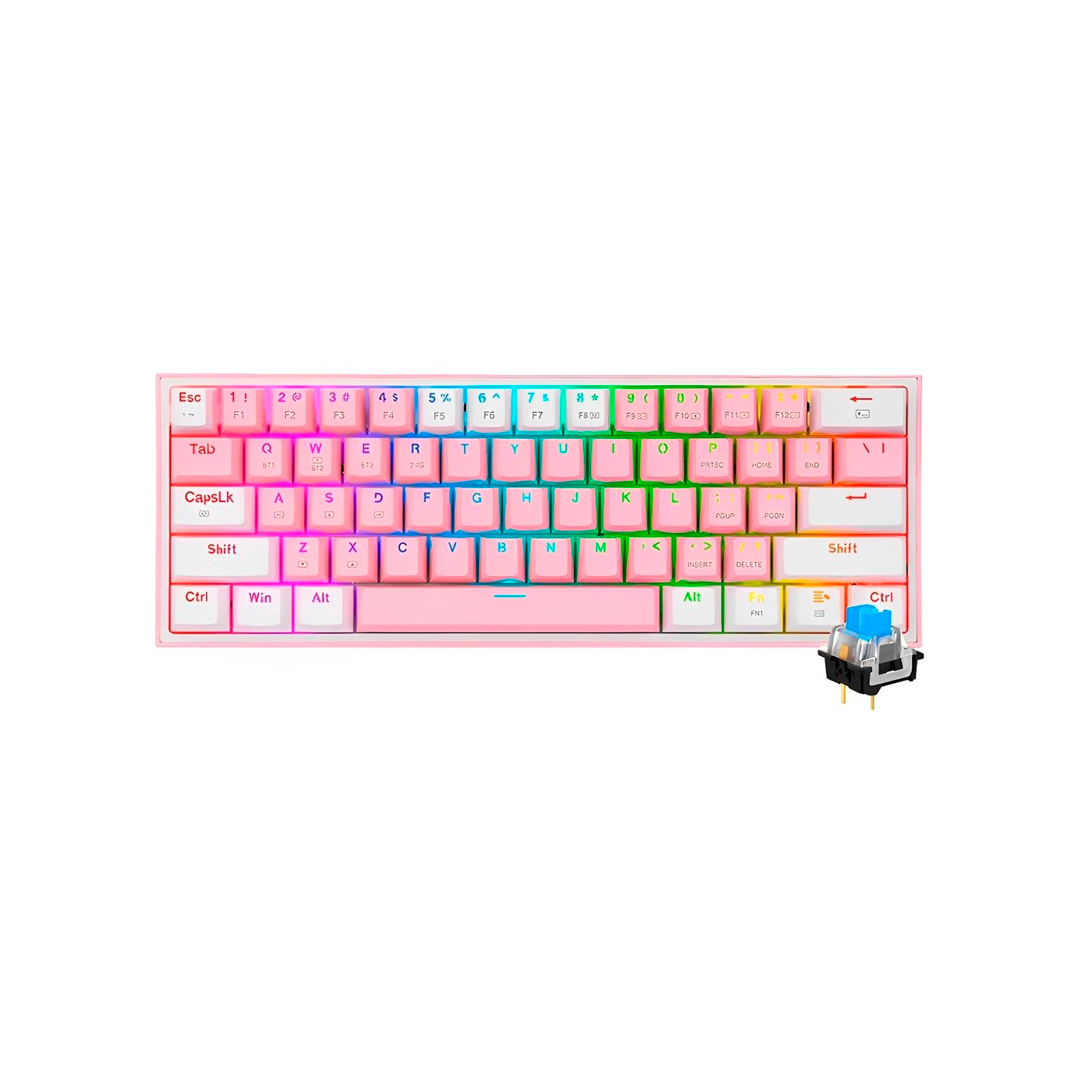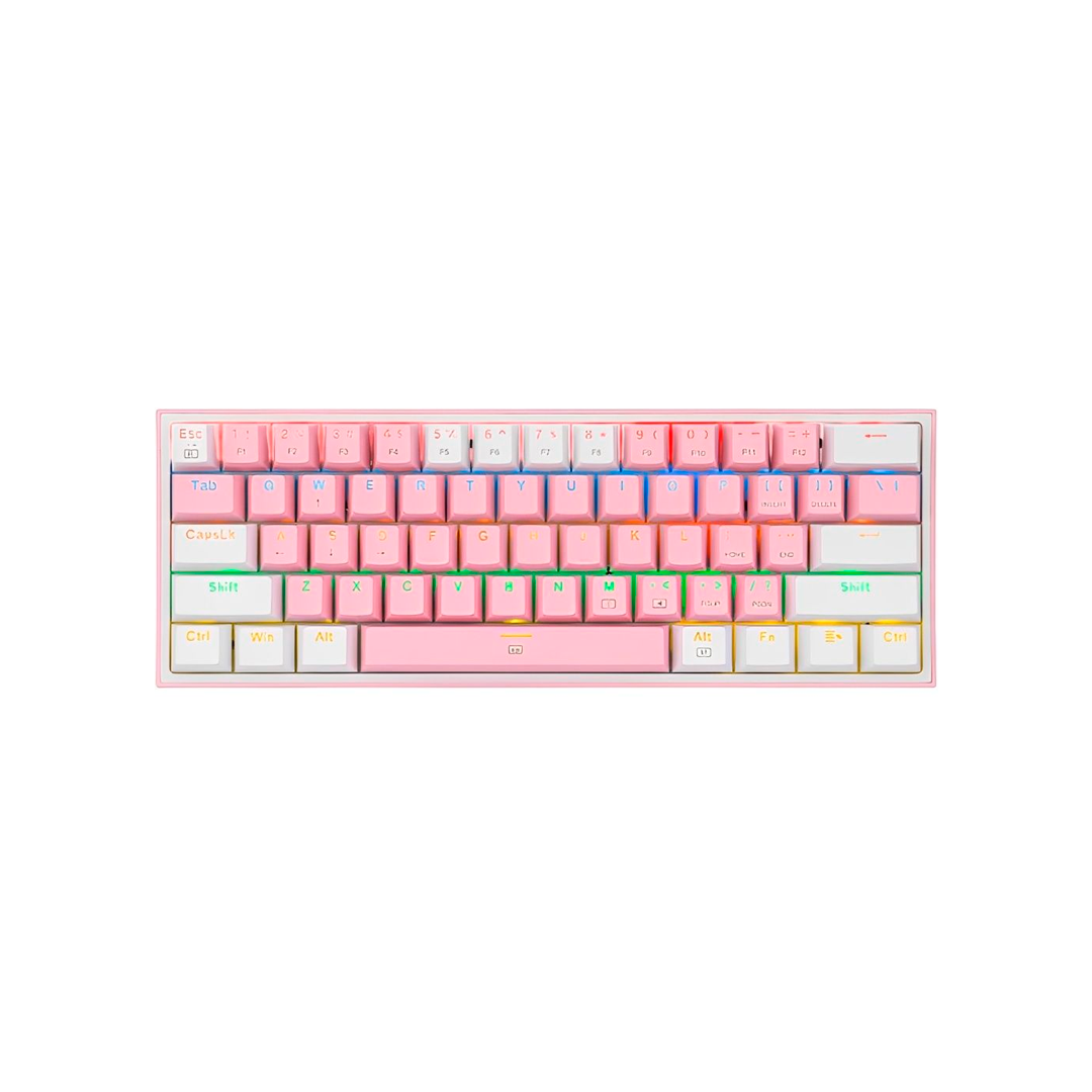 O teclado USB gamer Redragon K617-R Fizz Rainbow White/Pink (USA) é uma opção ultra-compacta (layout 60% com 61 teclas) que combina estética vibrante e pronuncia-performance gamer. Com keycaps em branco e rosa, switches lineares ou táteis (dependendo da versão) e iluminação RGB personalizável, este teclado oferece excelente experiência para jogos e digitação em setups modernos.